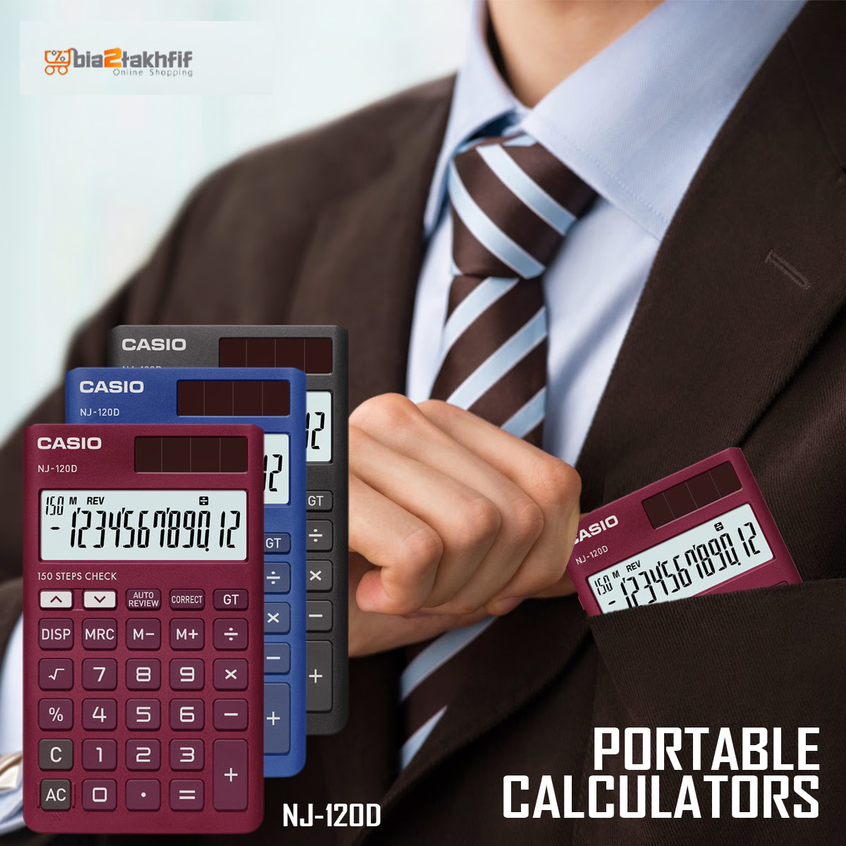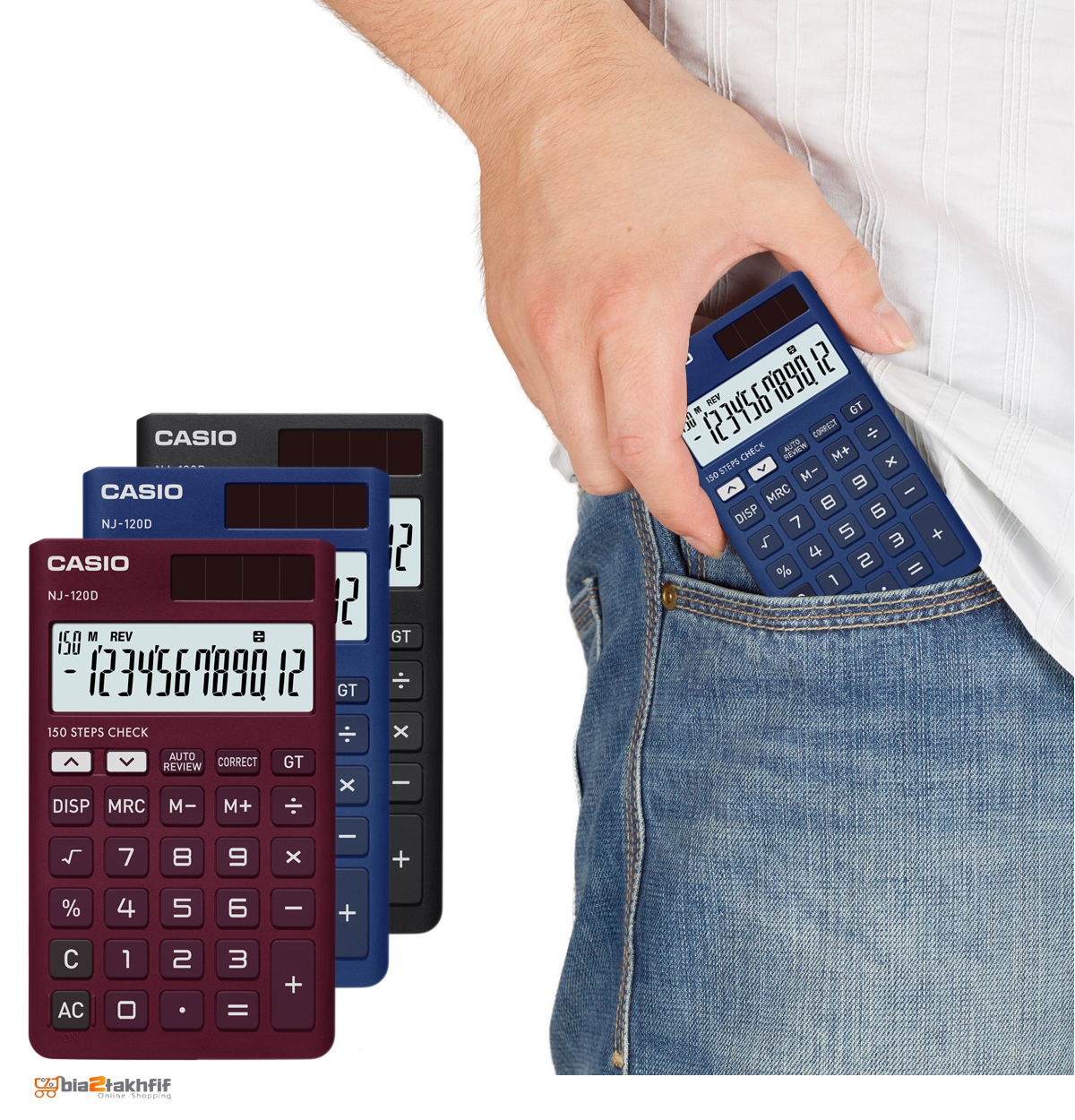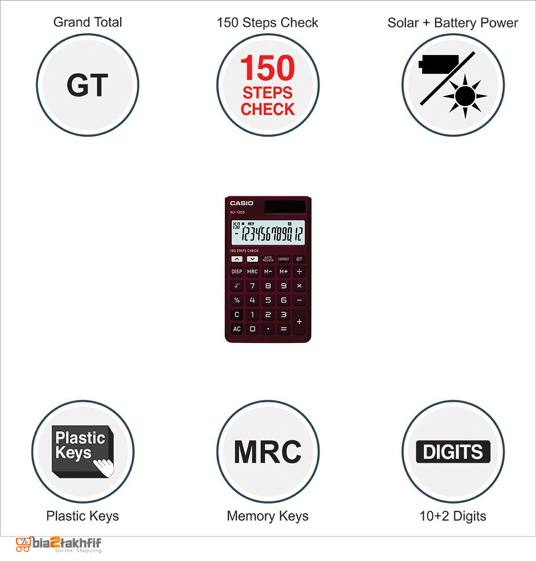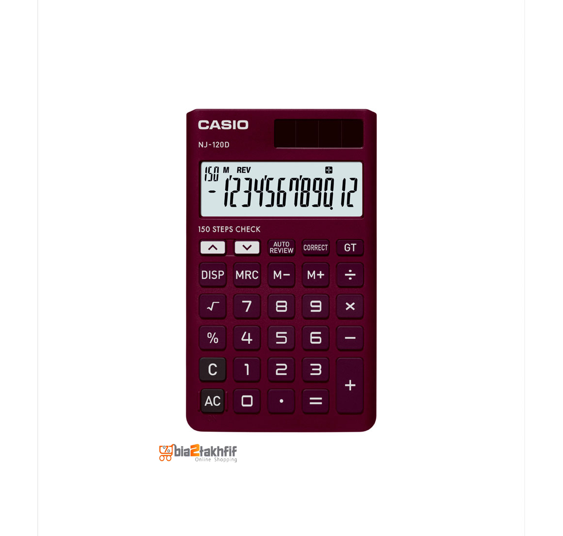 صفحهنمایش بهکاررفته در این مدل قادر است تا 12 عدد را نمایش دهد که نشان از حرفهای بودن دستگاه است. قابلیت کنترل دادههای ورودی تا 150 مورد آن را برای استفاده در فروشگاه ایدهآل کرده است. صفحهنمایش بزرگ این ماشینحساب خوشدست و قابلحمل خواندن اعداد را بسیار آسان نموده و اعداد را در 4 فرمت مختلف به نمایش میگذارد. برق مصرفی NJ-120D از دو منبع خورشیدی و باتری تأمین میشود. با استفاده از پنل خورشیدی تعبیهشده در قسمت سمت راست و فوقانی دستگاه میتوانید در طول روز و یا در هنگام وجود نور کافی در محل بدون نیاز به بارتی باتری را از نور خورشید تأمین نموده و از دستگاه استفاده نمایید. باتری ماشینحساب در مواقع تاریک بودن محیط و عدم وجود نور کافی در محل میتواند مورداستفاده قرار گیرد.