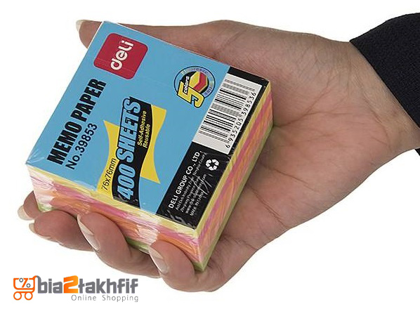 کاغذ یادداشت چسب دار کد 39853 بسته 400 عددی دلی 5 رنگ مختلف دارد. این محصول دارای ابعاد 76 × 76 میلی متر است :