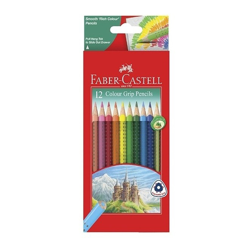 مداد رنگی فابرکاستل (grip-01) مجموعه 12 عددی، در بسته بندی مقوایی قرار گرفته است .از ویژگی های بارز این مداد رنگی ها می توان به نوک بسیار مقاوم در برابر شکستن و پوششی ازبهترین چوبهای سرو اشاره کرد.