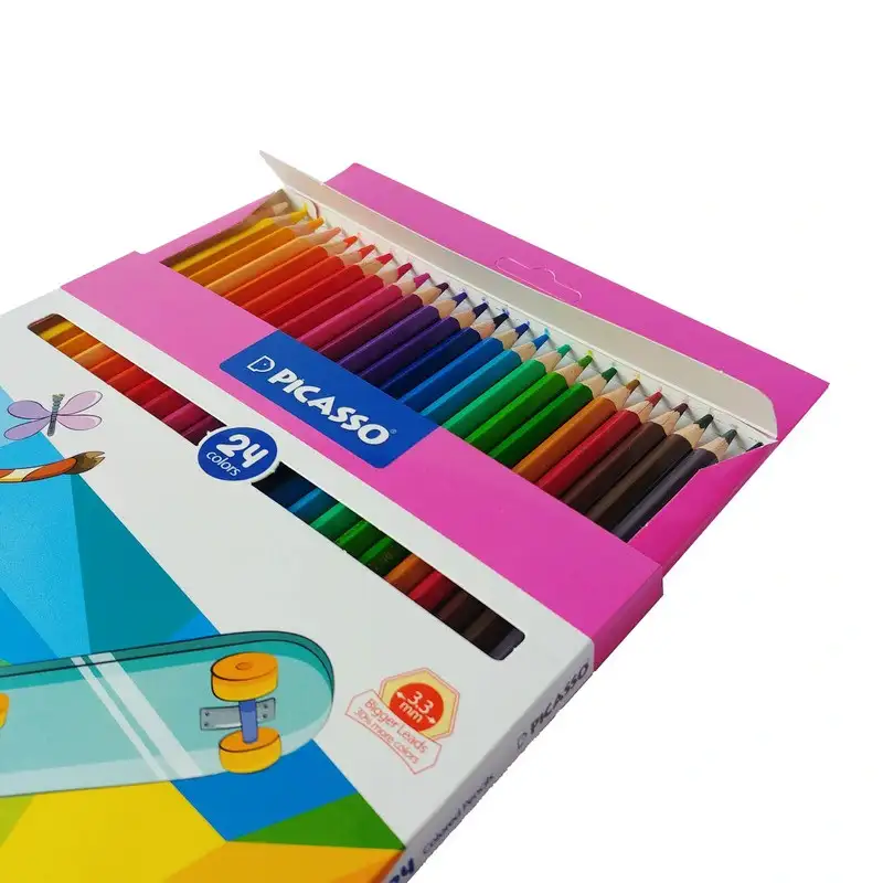 مداد رنگی 24 رنگ جعبه مقوایی پیکاسو (طرح جدید) یکی از مرغوب ترین و باکیفیت ترین مداد رنگی ها نسبت به دیگر برندها می باشد به این علت که چوب این مداد کیفیت عالی و بالایی دارد و هم گرافیت موجود و استفاده شده در مغز این مداد ، در 24 رنگ مختلف بسیار مرغوب و ویژه است.