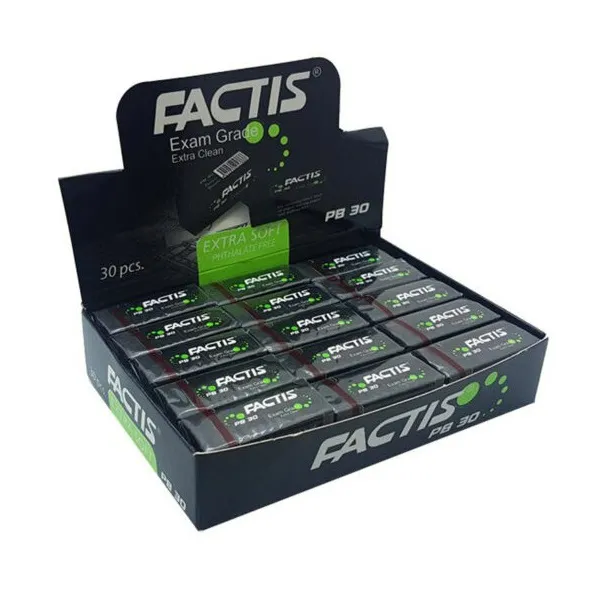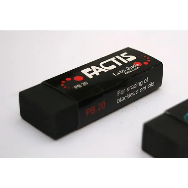 پاک کن فکتیس مدل PB20 بسته 20 عددی ،این پاککن محصولی از شرکت اینوکس بوده که به صورت جامد و رنگ مشکی میباشد .ابعاد این محصول 40 × 15 × 10 سانتیمتر میباشد. میزان برادهی ایجاد شده در هنگام استفاده از پاککن، در این محصول به حداقل رسیده است. بهعلاوه به منظور راحتی بیشتر مصرف کننده، یک پوشش مقوایی متحرک هم در اطراف پاککن قرار گرفته است.