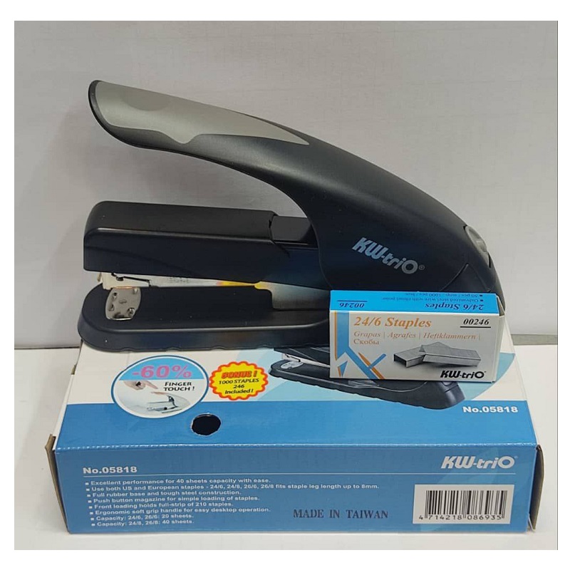 منگنه (نرم زن) کی دبلیو تریو مدل 5818، یکی از تولیدات برند کی دبلیو تریو می باشد.منگنه (5818) در ابعاد 195*115*45 میلی متر و جنس بدنه فلزی تولید شده است.از مهم ترین مزیت این منگنه در سایزهای مختلف (26.6-24.6-24.8-26.8) میلی متر با ظرفیت دوخت حداکثر 20 تا 40 برگ است .از دیگر ویژگی های این منگنه می توان به زیر پوشش پلاستیکی اشاره کرد که مانع از لغزش روی سطوح می شود .